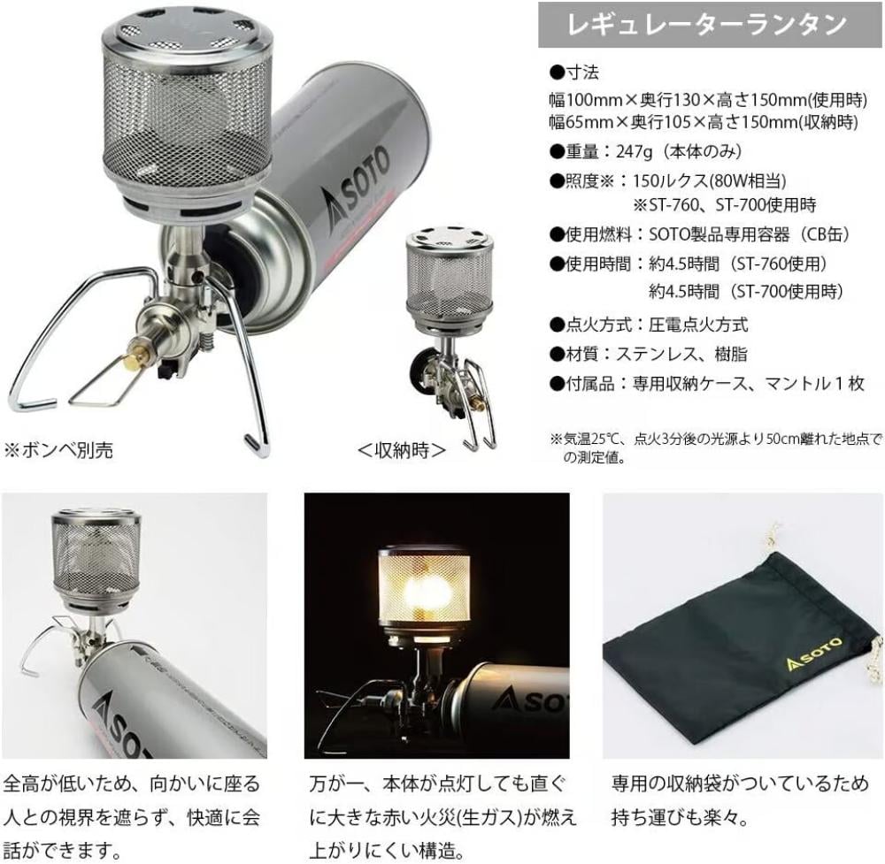تم تجهيز فانوس SOTO بمنظم. قد تقلل فوانيس غاز الكاسيت النموذجية من كمية الضوء بسبب برودة أسطوانة الغاز، ولكن الفانوس المنظم مجهز بمنظم صغير خاص يسمح باستخدام الغاز مباشرة بعد الإشعال واستخدام الغاز. بالإضافة إلى ذلك، من الصعب أيضًا أن تتحلل بسبب انسداد الفوهة.